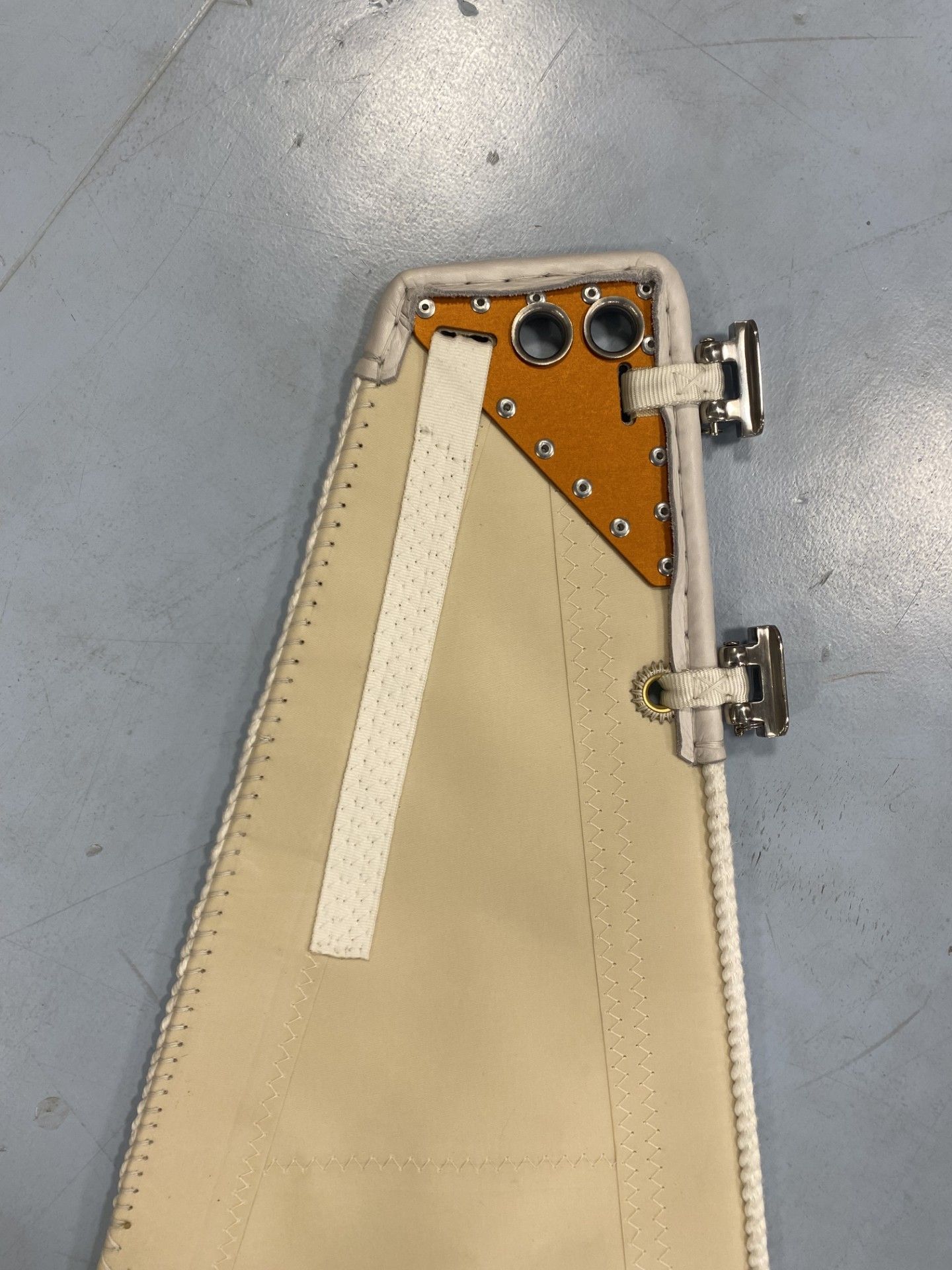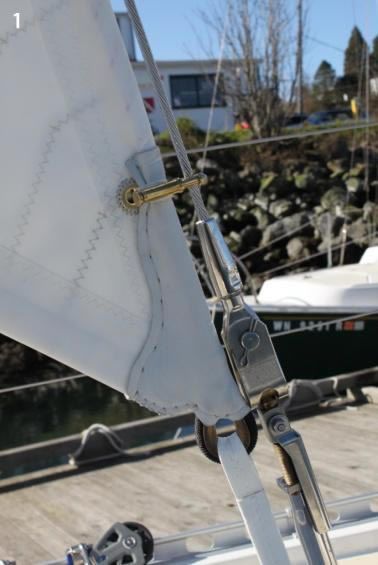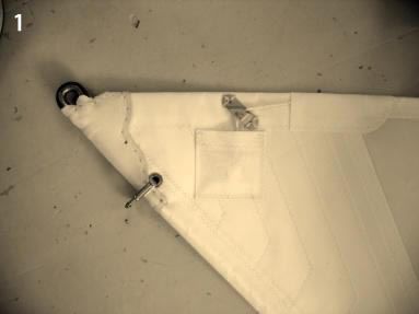 - Antal clew block secured to sail with spectra webbing covered with UV protective material