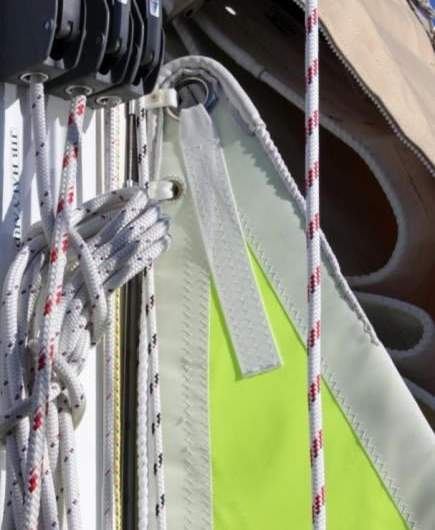 - Webbing handles at reef tacks that aid in pulling the sail down when reefing or striking sail
